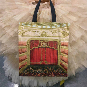 Add a touch of glamour when out and about with this beautiful re-usable tote. Our Night at the Opera House tote features Elena's painting of the stunning Main Stage facade, including the famous red velvet curtains, gilt frescos and Royal Opera House crest printed on cotton.