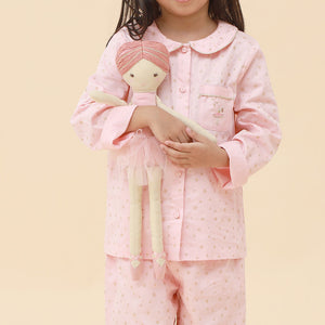 The Ballerina Star Pyjamas shine with a glittery star pattern and an embroidered ballerina on the front pocket, topped off with an adorable round collar. Gold accents highlight the collar, cuffs, and pocket, while the button-up top and stretchy bottoms ensure a comfy, playful fit. These Pyjamas are sure to become a new bedtime favourite for any aspiring dancer!
