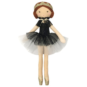 Odile, the Black Swan ballerina doll, stands in striking contrast to the White Swan Odette. She wears a shimmering black tutu and a golden crown, making an unforgettable impression. This carefully handcrafted keepsake is perfect for young dancers to cherish and inspire. Share the enchantment of the ballet with this special keepsake.