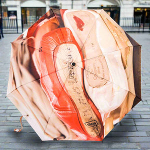 The Recycled Ballet Shoes Umbrella is known for its sturdy design, featuring an image of colourful ballet shoes from the Royal Ballet and Opera Dye department.