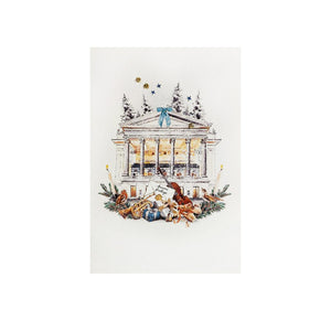 Celebrate the festive season with this stunning Christmas card, showcasing the iconic Royal Opera House facade in a beautifully illustrated design. Artist Elena Deshmukh has captured the architectural splendour of this 1858 landmark with meticulous hand-adorned details, making it an ideal choice for anyone who treasures the Royal Ballet and Opera. A sophisticated greeting that brings the grandeur of Bow Street into your holiday wishes.