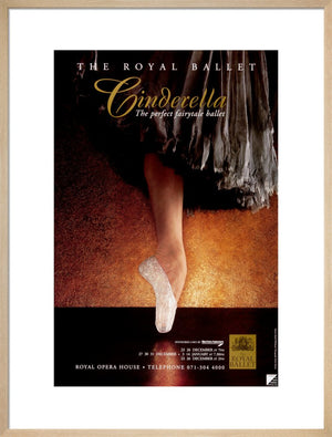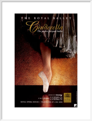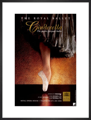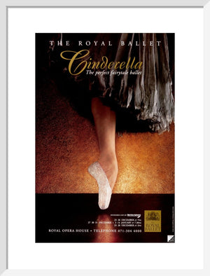 This Cinderella Print is a reproduction of an archive ballet poster from 1987. Featuring a photograph by Kelvin Murray of Rachael Whitbread on pointe in a sequinned ballet shoe.