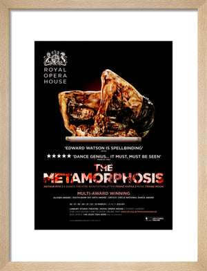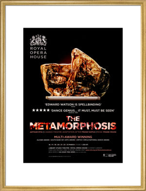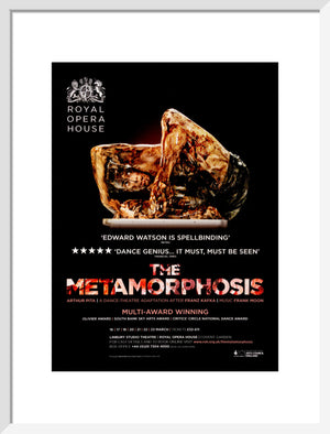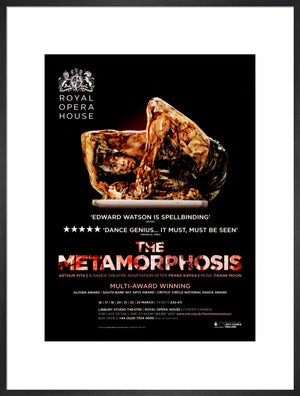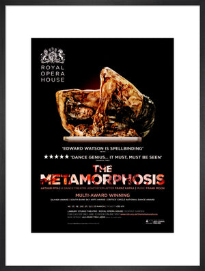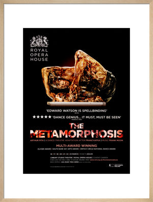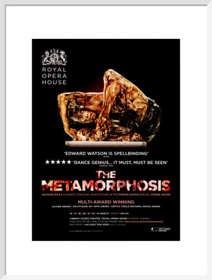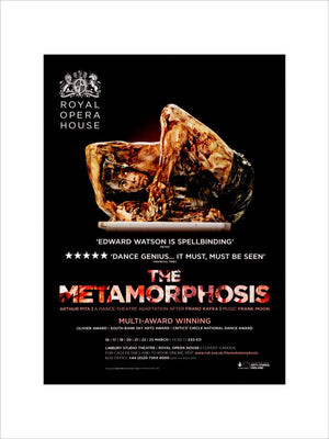 The Metamorphosis Print is a reproduction of the ballet performances in the Linbury Studio Theatre from 2013. The print features a photograph of dancer Ed Watson from the Arthur Pita production taken by Alastair Muir.