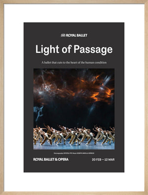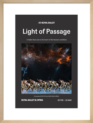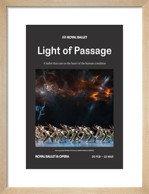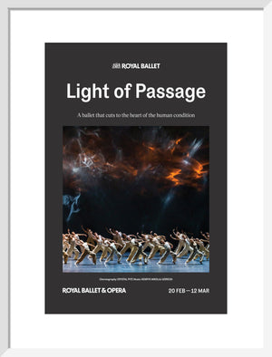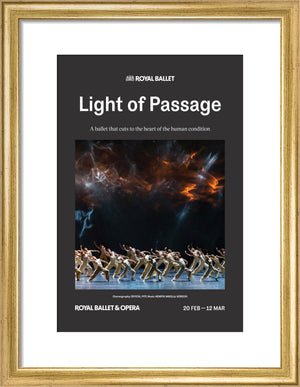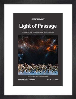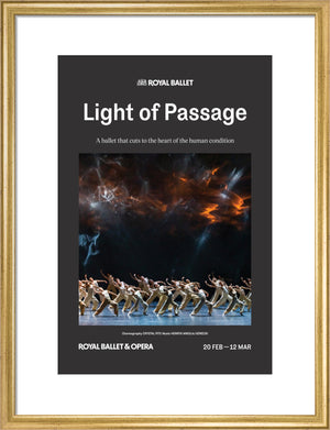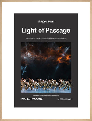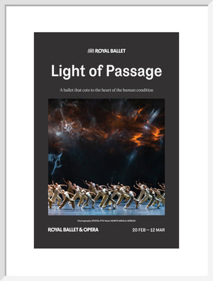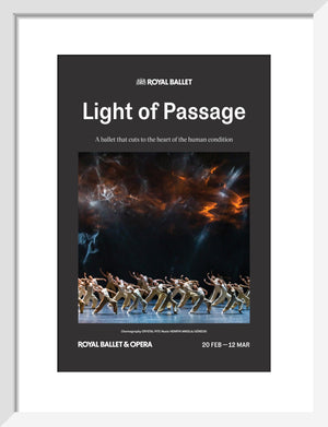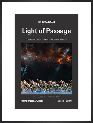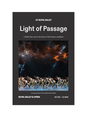 A reproduction of the poster for Crystal Pite’s poignant work Light of Passage which grapples with themes of safe passage, displacement, community and mortality. Performed at the Royal Ballet and Opera, February - March 2025.
