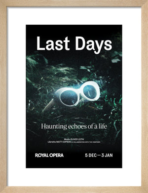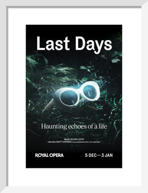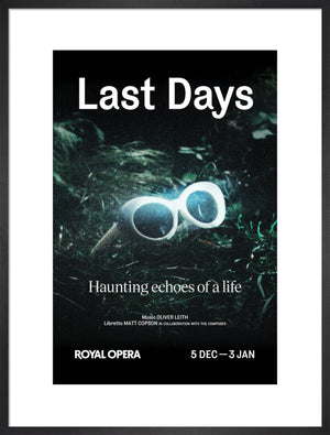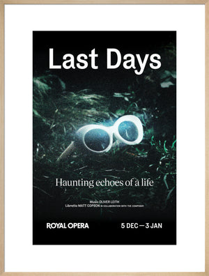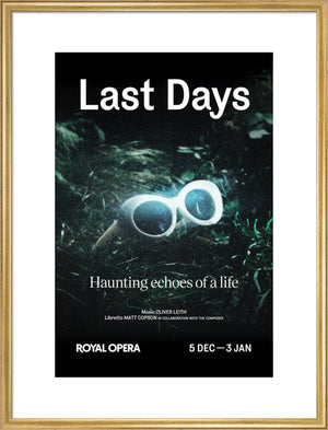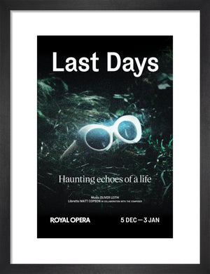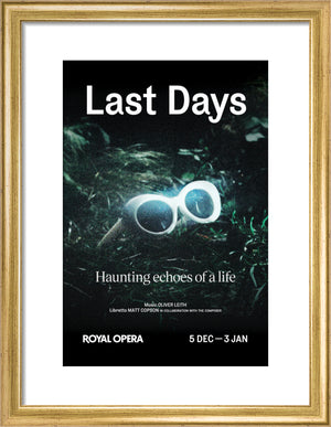 Haunting echoes of a life.Order your custom print now for the opera Last Days, expertly handcrafted by King & McGaw in Newhaven. Choose from various sizes and frames each carefully crafted with exceptional attention to detail.