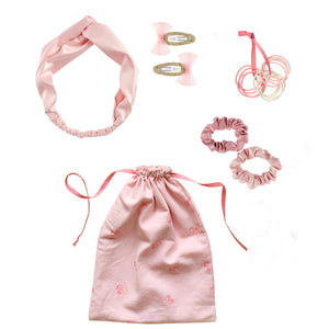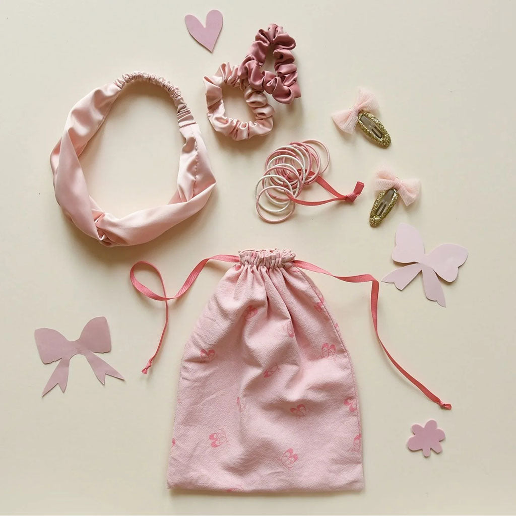This Ballet Gift Set is perfect for a little dancer, featuring a lovely collection of hair accessories neatly tucked inside a soft fabric drawstring bag decorated with dainty ballet shoes. Each set includes a satin headband, two tulle bow clips, four satin scrunchies, and 12 mini pink elastics.