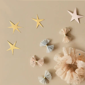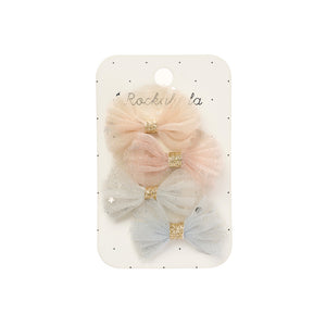 These Sparkly Tulle Bow Clips add a fun and twinkling touch to your child’s outfit in a simple, stylish way. The set comes with four clips in two different colours, a pale blue and a blush pink, finished off with a glittery gold band around the middle for maximum sparkle!