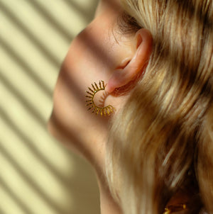 Add an elegant touch to any outfit with the Aylin Hoop Earrings, expertly handcrafted with recycled brass and 21ct gold plating. The intricate hand-hammered texture and modern sun ray details elevate the vintage boho style.