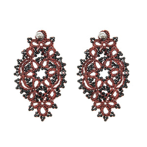 Expertly crafted from luxurious silk lace, our Night at the Opera earrings are the ideal complement for any evening performance. Featuring metallic red accents and natural black gemstones, these earrings add a touch of sophistication to your attire.
