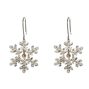 Our Nutcracker Snowflake earrings are handmade by the Flowering Desert Project which provides training and fairly paid work for women from rural communities in Tamil Nadu, Southern India. The earrings are hand cut from brass and planished using a specialist hammer to give it texture then silver plated, they each have a pearl bead in the centre. See our full Just Trade Collection here and other earrings.