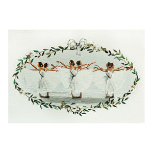 Beautifully illustrated and hand‑decorated by artist Elena Deshmukh, this Giselleballet greeting card features the corps de ballet of The Royal Ballet, framed by a decorative leafy wreath and bow.