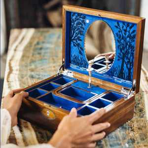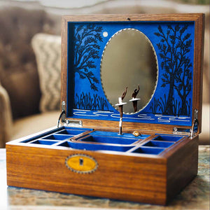 The Ballet Musical Jewellery Box by Wolf is a celebration of their original pirouetting ballerina box, featuring exquisite walnut veneer and a midnight blue interior. Its custom scallop edged mirror is adorned with a beautiful Swan Lake embroidered design by Fiona Howard, showcasing a serene landscape of trees and a lake.