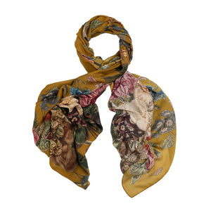 This large golden scarf draws inspiration from the Dutch Masters, featuring an exquisite print of blooming primroses, auriculas, and polyanthus flowers.Its vibrant mix of colours makes it a versatile accessory that complements a wide variety of outfits.