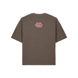 The Royal Ballet and Opera T-shirt is an oversized unisex boxy fit. Made from a soft heavy weight organic cotton, it displays the Royal Ballet and Opera across the front in pink text and a central logo at the back, it combines comfort with a striking colour contrast.