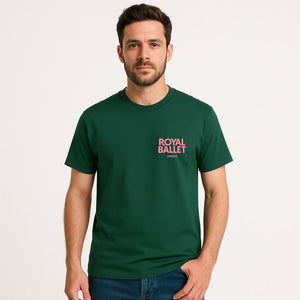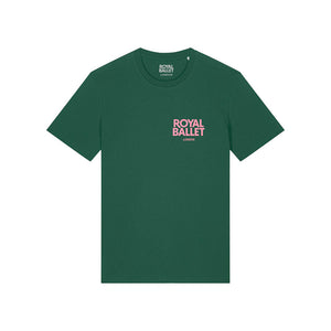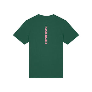 Show your love for The Royal Ballet in style with this comfy, medium-fit unisex green cotton t-shirt. This lightweight garment, made from soft organic jersey fabric, features eye-catching pink text that contrasts beautifully with the bottle green background.