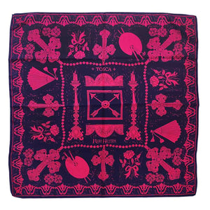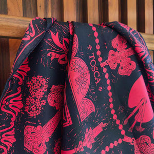 Channel the dramatic allure of Puccini’s Tosca with this striking pink and black silk scarf, designed exclusively for the Royal Ballet and Opera by acclaimed accessories designer Rory Hutton. Inspired by the intensity and emotion of this legendary opera, the scarf showcases intricate linocut prints of significant motifs, including a pair of candlesticks, Tosca’s floral offering to the Virgin, a delicate hand fan, an artist’s palette, and a cross-shaped jewelled pendant.
