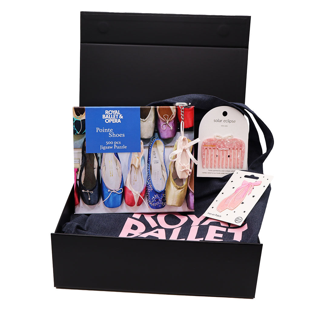 Delight any ballet lover with this carefully curated Ballet Gift Box. Full of gifts inspired by the RBO, featuring a ballet shoe keyring, an engaging pointe shoe jigsaw, and a beautiful pink bow hair comb. Complete with a stylish Royal Ballet London Shopper, this set is the perfect way to celebrate the art of dance and make every day a little more graceful. A thoughtful gift to inspire passion and joy.