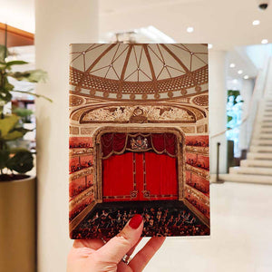 Elevate your note-taking with the recycled leather Auditorium Notebook. Its bespoke design captures the anticipation before an evening performance, inspired by the Main Stage facade, red velvet curtains, gilt frescos, and Royal Opera House crest.