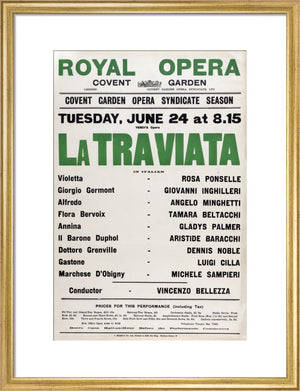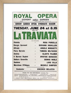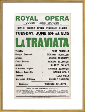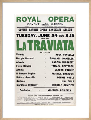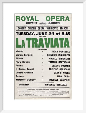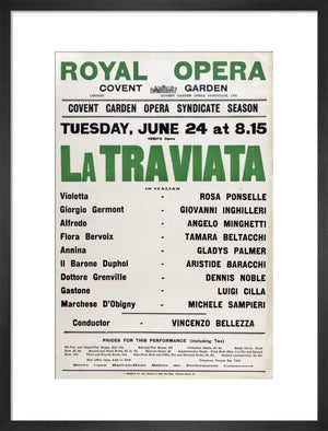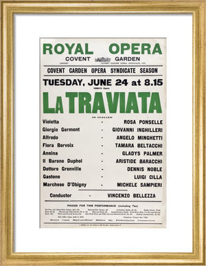 This La Traviata Print features a classic design from our Archives. It's a reproduction of the poster for the Covent Garden Opera Syndicate performance of Verdi's opera June 1930 at the Royal Opera House, providing a unique glimpse into this historic event.