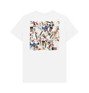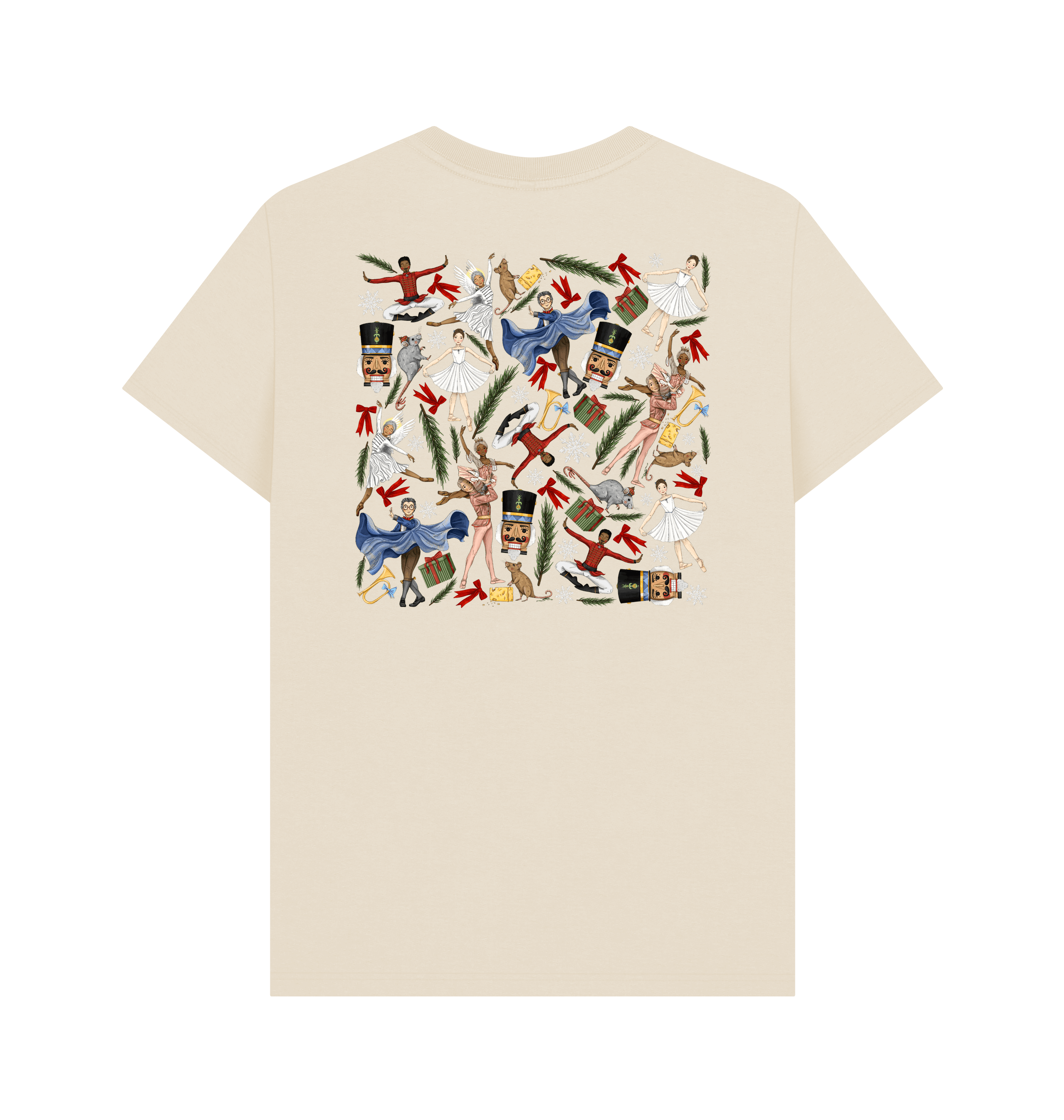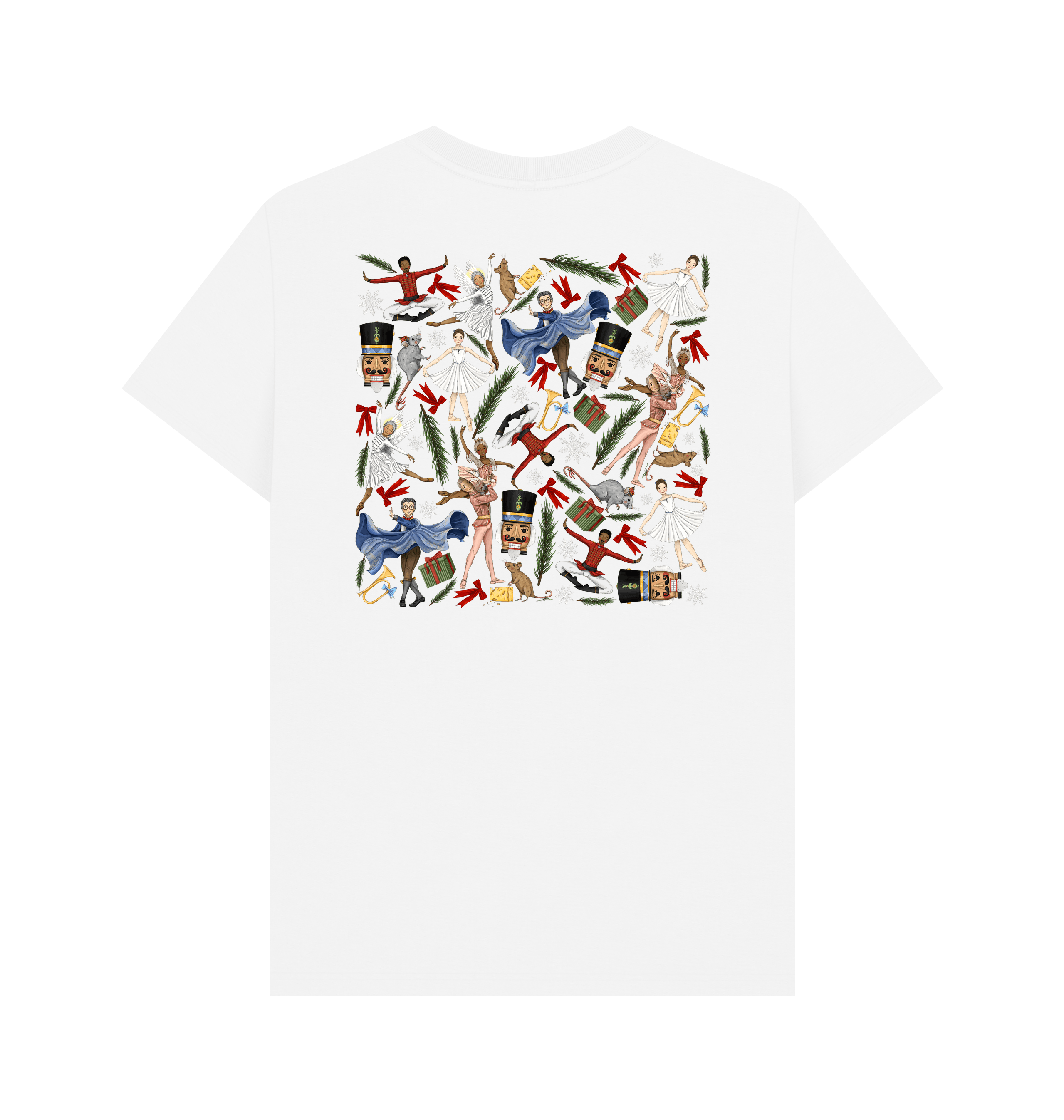 Celebrate the magic of the Nutcracker with this fun custom printed t-shirt showcasing Kate Hester's delightful illustrations. Clara and the Nutcracker jump across the front, while the back showcases a captivating Nutcracker design. A delightful choice for ballet enthusiasts and festive fashion lovers!