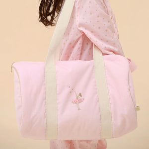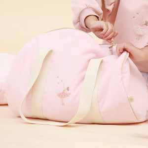 This charming ballet duffle bag for children showcases a lovely embroidered ballerina dancing with gold stars. Crafted from pink cord fabric, it includes comfy cream cotton shoulder straps, accented gold trim and a secure zip closure.