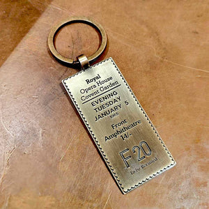 This brass ticket keyring is based on a 1965 ticket from the Royal Ballet and Opera Archives. It's a fun, unique and historic accessory for keeping your keys secure. The front of the keyring displays the ticket for seat F20 at the front of the Amphitheatre, while the back features the Royal Ballet and Opera logo.