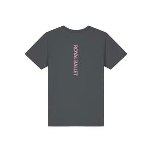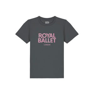 This Kids T-shirt is perfect for little ballet fans, providing all-day comfort and sparkle. Made from soft organic cotton jersey, it features the glittery pink text "Royal Ballet London" print set against a dark anthracite grey background—ideal for fun adventures.