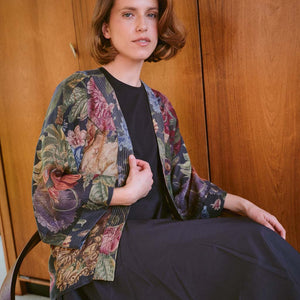 A luxurious layer for cooler days, this wool kimono jacket takes inspiration from the Dutch Masters, featuring an exquisite print of blooming primroses, auriculas, and polyanthus flowers. Designed for comfort and elegance, it’s the perfect piece to elevate your autumn and winter wardrobe.