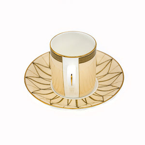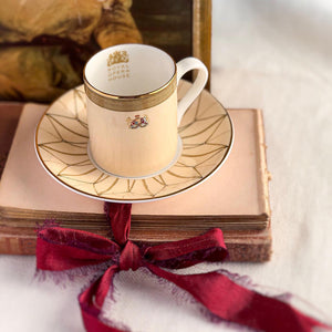 The Pink Ceiling Coffee Cup and Saucer is crafted in The Potteries, Stoke‑on‑Trent, and showcases Elena Deshmukh’s elegant design inspired by the Main Stage auditorium ceiling’s intricate gold gilt.