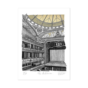 This charming print showcases a detailed architectural drawing of the Royal Opera House Auditorium. It's a Limited Edition Silk Screen Print, crafted from an original hand drawing, complete with the artist’s signature and edition number. Printed on 280gsm acid-free fine art paper using archival Lascaux inks, this collection of only 100 prints features a stunning Rich Pale Gold block ceiling.