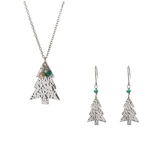 Receive £10 off when you purchase this Christmas Tree Jewellery Bundle. Our Nutcracker Tree necklace and earrings are skilfully crafted by the Flowering Desert Project, which gives training and equitable wages to women from remote villages in Tamil Nadu, South India. The brass pieces are hand-cut, hammered to give texture, and silver-plated. On top of the tree pendant and earrings lay green glass beads.