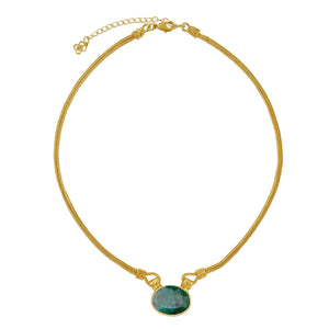 Add glamour to your night at the theatre with the Daphne Emerald Chain Necklace, handcrafted with 21ct gold-plated recycled brass and an oval-shaped faceted emerald gemstone threaded through a double chain design. Find complimenting earrings in our Ottoman Hands collection.