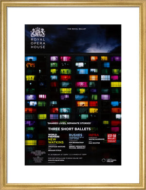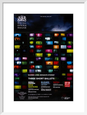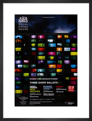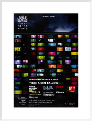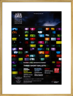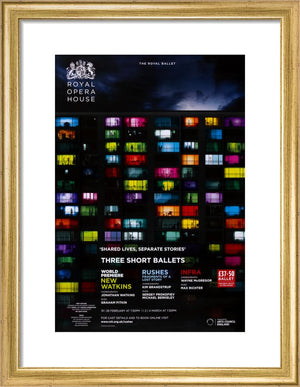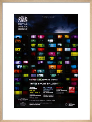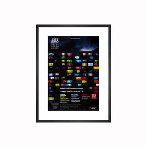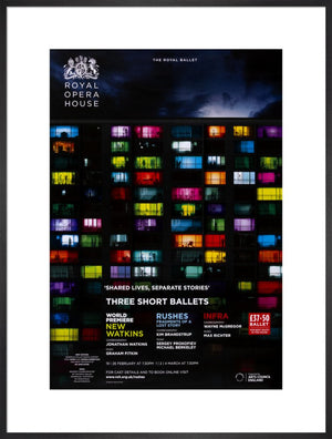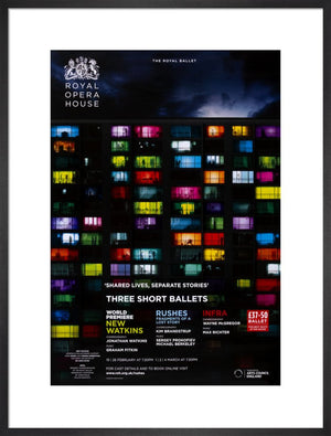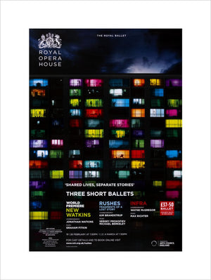 As One Print is a reproduction of The Royal Ballet poster for the mixed bill consisting of As One (2010), Rushes- Fragments of a Lost Story (2008) and Infra (2008). Performed 19 February - 4 March 2010 at the Royal Ballet and Opera. Designed by Dewynters.