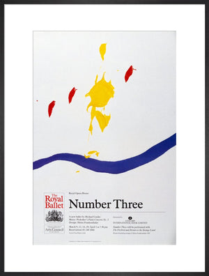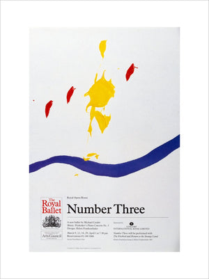 Our Number Three Print is a reproduction of an archive poster for the mixed bill performed by The Royal Ballet in 1985. Featuring Number Three a then new ballet by Michael Corder, The Firebird and Return to the Strange Land by Jiří Kylián.The print is illustrated with details of a backdrop design by Helen Frankenthaler, typography by Leo Maggs.