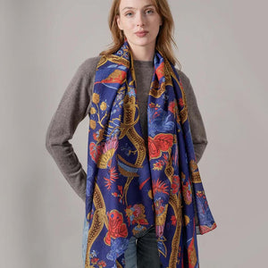 Generously sized at 100 x 200cm, this online-exclusive scarf offers endless versatility—perfect for layering over outfits or wearing as a delicate cover-up. The design showcases a royal blue base with a traditional Indian chinoiserie gold pattern, accented by cobalt and red peacocks for a striking festival of colour.