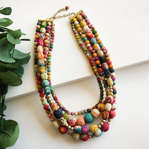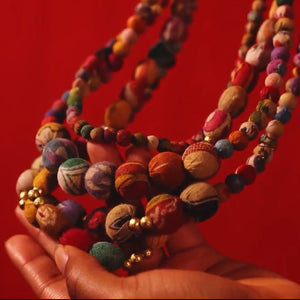 This unique Aura Necklace has been consciously crafted with four vibrant strands of repurposed Kantha textile beads inlayed with sets of golden brass beads. Each piece is one-of-a-kind with its own colours and patterns.