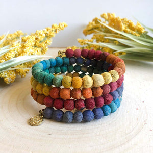Kantha fabric beads are hand selected to create a charming rainbow gradient, this wrap-around bracelet is a unique addition to any outfit. The repurposed textiles add individuality with their stunning hues and patterns, while a small brass charm adds a touch of elegance to complete the look.