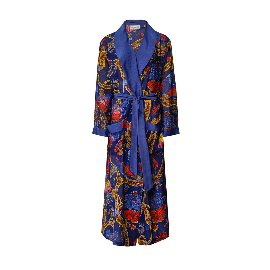 The design showcases a royal blue base with a traditional Indian chinoiserie gold pattern, accented by cobalt and red peacocks for a striking festival of colour.