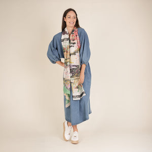 The Spring White Scarf takes inspiration from Japanese landscapes, featuring a crisp white background with oriental garden silhouettes superimposed on a patchwork of black and pink blossoms and willow trees. The lightweight large scarf is 100 x 200cm making it perfect for layering or worn as a delicate cover up during warm weather.